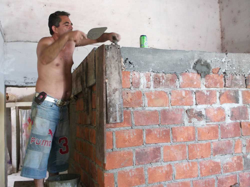 Op de foto zien we hoe metselaars bezig zijn in het huisje van Oly.