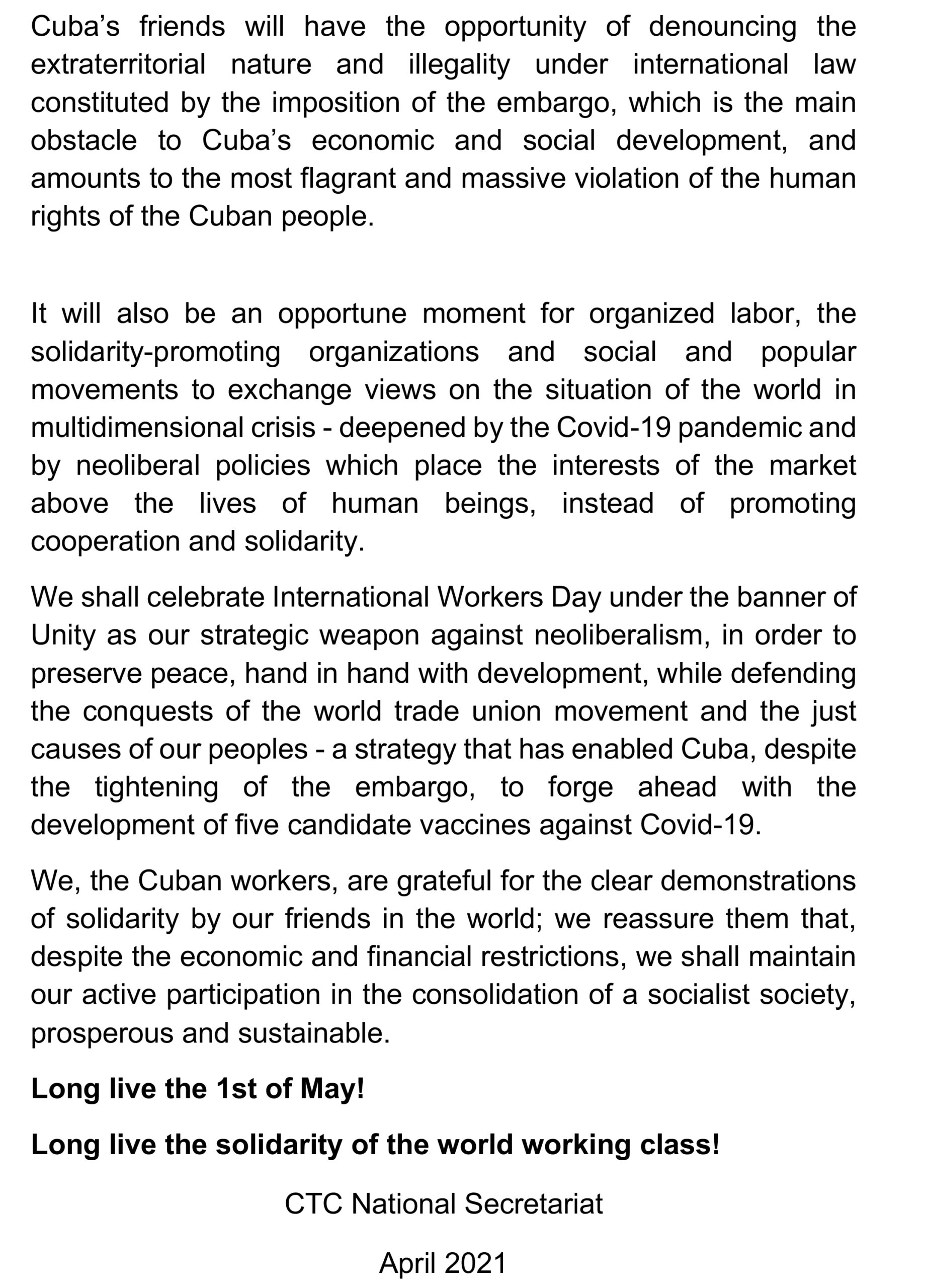 Under the present conditions, the embargo represents a huge burden for the Cuban population and economy, with particularly devastating effects owing to the COVID-19 pandemic: Cuba has been forced to allocate considerable resources to urgently secure necessary equipment and materials for its national health system.
