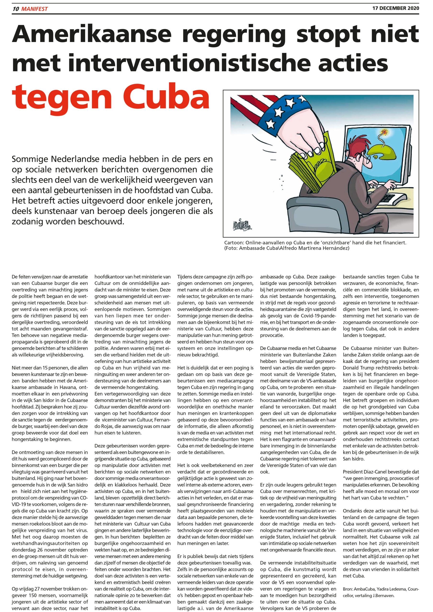 Estos hechos se han presentado como una situación extraordinaria y de gran alcance en Cuba sobre la base de la manipulación realizada por activistas en redes sociales y que algunos medios de forma irresponsable se han hecho eco. De manera intencional estos activistas en Cuba y en el extranjero se mantuvieron enviando mensajes directos a diferentes fuentes en los que refirieron supuestos actos de violencia contra las personas que acudieron al Ministerio de Cultura de Cuba y otras calumnias. Sus mensajes abogaron por la desobediencia civil e incitaron al odio y realizaron amenazas de todo tipo contra personas con opiniones diferentes o que expresaron de forma objetiva los hechos, con el propósito de crear un patrón distorsionado y extremista sobre la realidad en el país para crear una opinión internacional sobre la existencia de un ambiente de inestabilidad en Cuba.