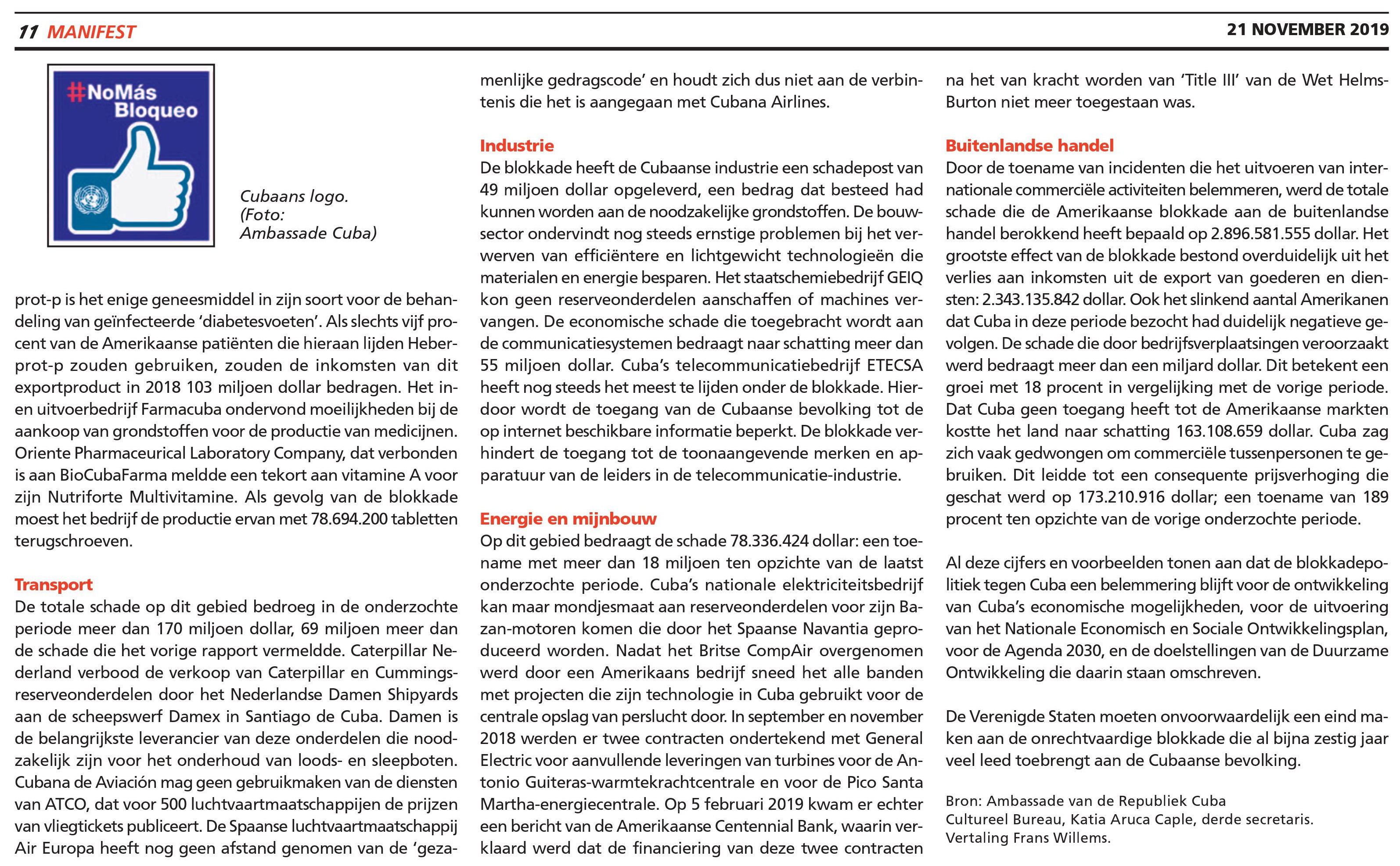Tevens actie: “Stop de onmenselijke blokkade van Amerika tegen het Cubaanse Volk”.