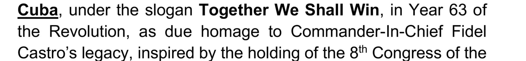 Meneer de president, we bekrachtigen Cuba’s vastberadenheid om door te gaan met: het spreken van de waarheid op een transparante manier, hoezeer dit sommigen ook van streek kan maken; het verdedigen van de principes en waarden waarin we geloven; rechtvaardige zaken ondersteunen; schendingen het hoofd bieden, net zoals we het hoofd hebben geboden aan buitenlandse agressie, kolonialisme, racisme en apartheid; onophoudelijk strijden voor de grootst mogelijke gerechtigheid, welvaart en ontwikkeling van onze volkeren, die een betere wereld verdienen.
