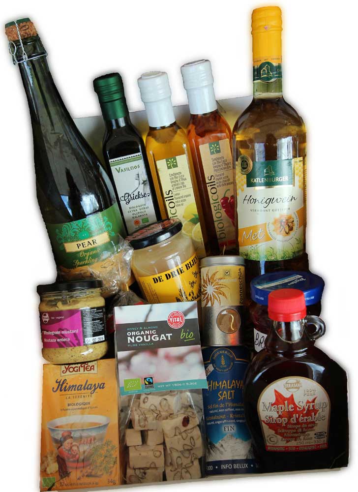 Dit pakket is uitgebreider dan het kleine pakket. Het bestaat eveneens uit een aantal Fair trade en EKO producten, zoals olijfolie, balsamico-azijn, hing, home made jam, wijn, chocolade en ahornsiroop. Geef uw speciale wensen aan ons door, dan maken wij een mooi aangepast pakket.
