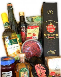 Dit pakket is uitgebreider dan het kleine pakket. Het bestaat eveneens uit een aantal Fair trade en EKO producten, zoals olijfolie, balsamico-azijn, hing, home made jam, wijn, chocolade en ahornsiroop en natuurlijk een fles overheerlijke Cubaanse rum van zeven jaar oud.