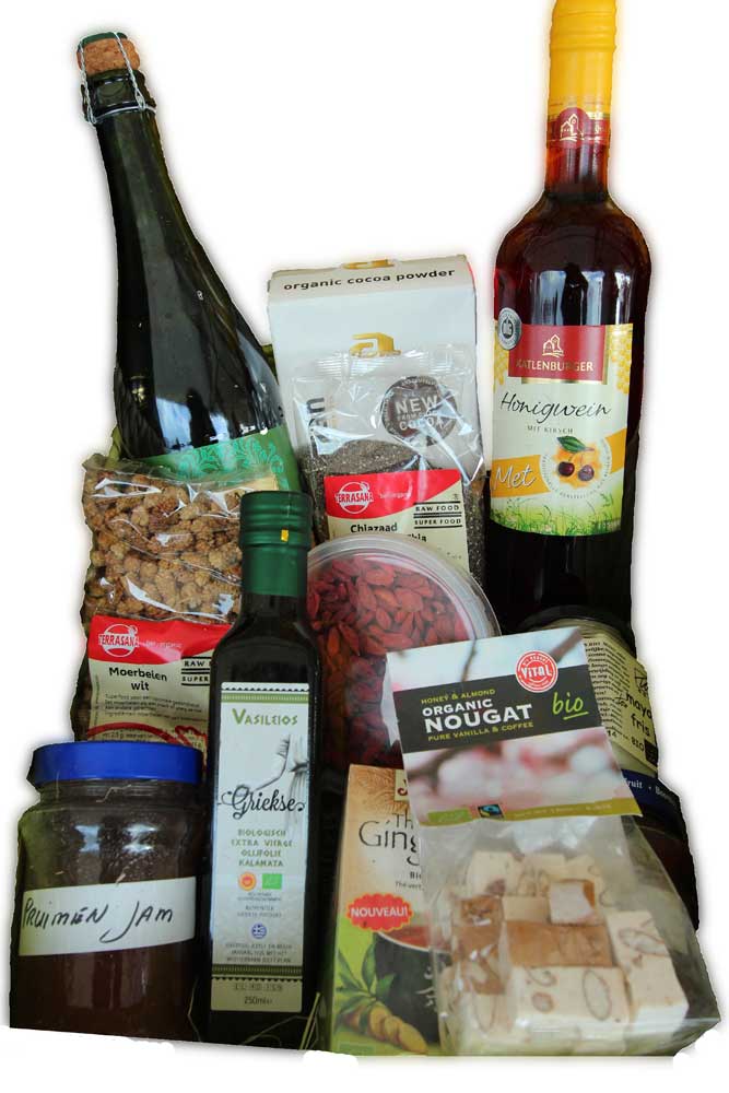 Dit pakket bestaat uit een aantal Fair trade en EKO producten, zoals olijfolie, balsamico-azijn, hing, home made jam, wijn, chocolade en ahornsiroop. Geef uw speciale wensen aan ons door, dan maken wij een mooi aangepast pakket.